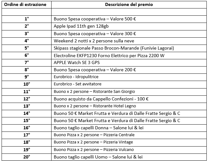 I vincitori potranno ritirare il premio questa sera o entro 60 giorni presso la sede, dal lunedì al venerdì (10.00–16.00), oppure contattando il responsabile Sig. Eddy Sartori al numero 347.9514011.